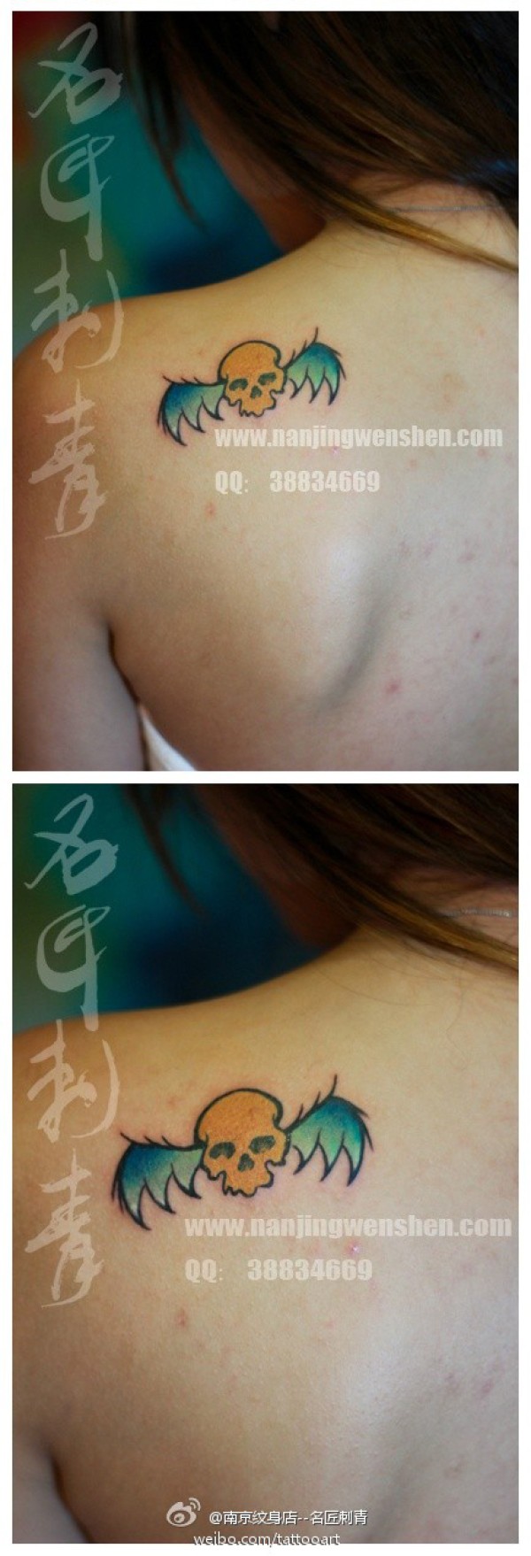 女生肩背经典小巧的骷髅纹身图案_骷髅纹身图案大全_纹身图吧