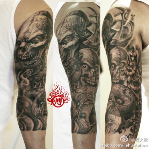 手臂很酷帅气的蛇与骷髅纹身图案_骷髅纹身图案大全_纹身图吧