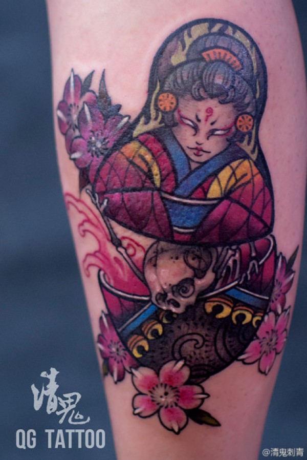 腿部潮流很酷的一款艺妓骷髅纹身图案_骷髅纹身图案大全_纹身图吧