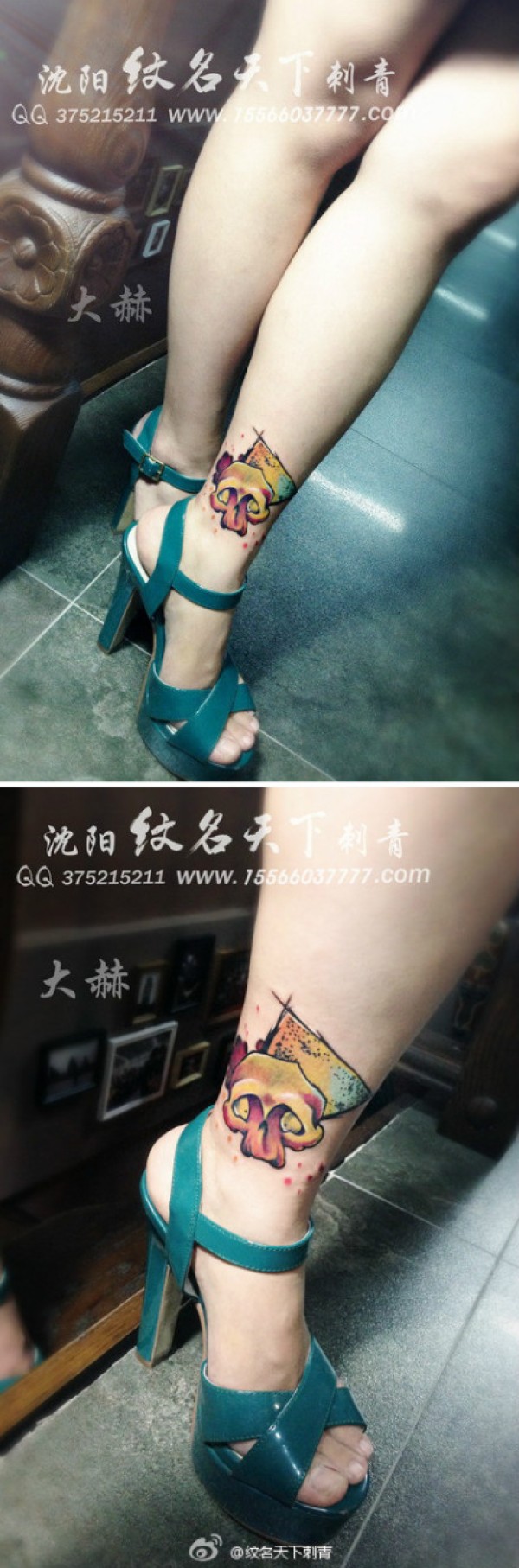 女生腿部好看潮流的彩色骷髅纹身图案_骷髅纹身图案大全_纹身图吧