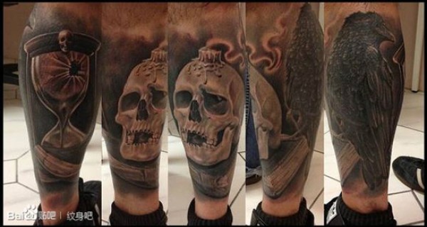 腿部时尚很酷的乌鸦骷髅纹身图案_骷髅纹身图案大全_纹身图吧