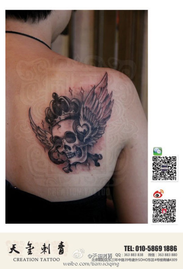 女生肩背时尚经典的骷髅翅膀纹身图案_骷髅纹身图案大全_纹身图吧