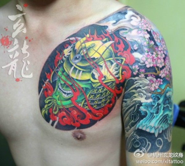 一款很酷经典的半胛日本武士与骷髅纹身图案_骷髅纹身图案大全_纹身图吧