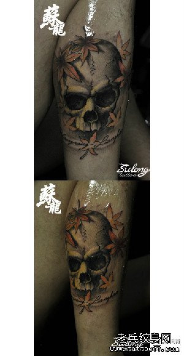 腿部经典时尚的骷髅与枫叶纹身图案_骷髅纹身图案大全_纹身图吧