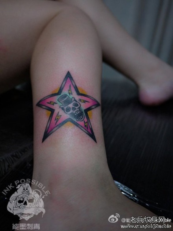 女生腿部潮流经典的五角星与骷髅纹身图案_骷髅纹身图案大全_纹身图吧