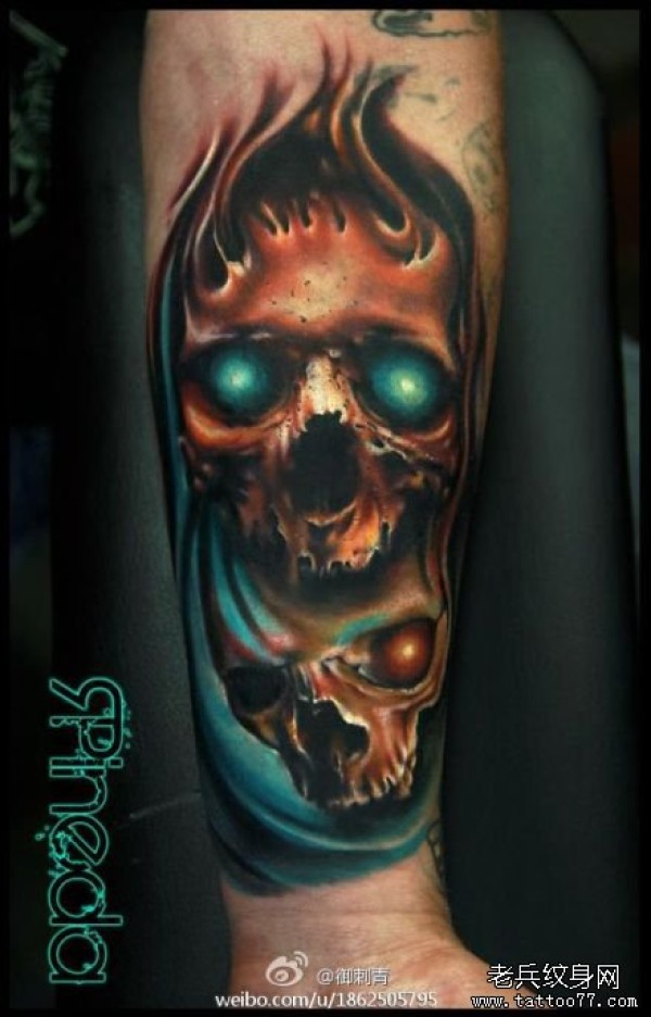 手臂一款很酷潮流的彩色骷髅纹身图案_骷髅纹身图案大全_纹身图吧