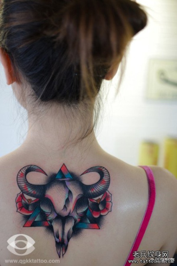 女生后背经典流行的羊头骷髅纹身图案_骷髅纹身图案大全_纹身图吧