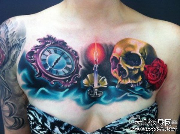 男人胸前帅气潮流的骷髅怀表纹身图案_骷髅纹身图案大全_纹身图吧