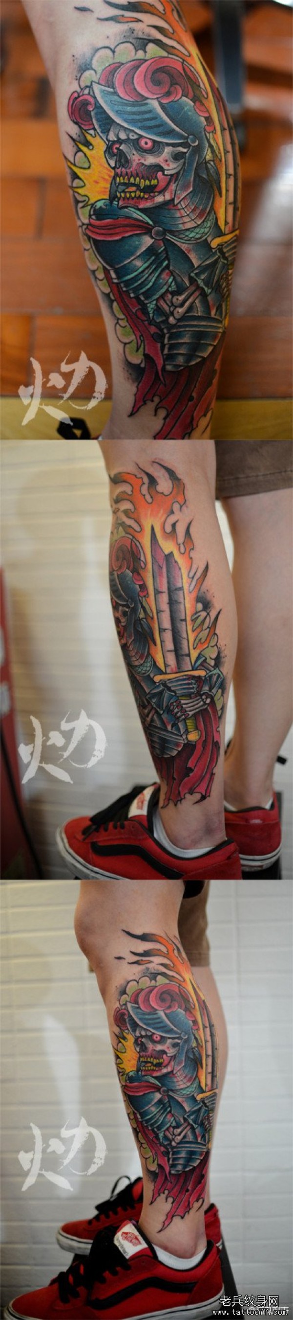 腿部超酷经典的一款骷髅武士纹身图案_骷髅纹身图案大全_纹身图吧
