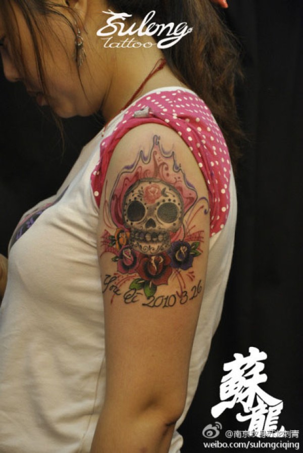女生手臂经典潮流的一款欧美花骷髅纹身图案_骷髅纹身图案大全_纹身图吧