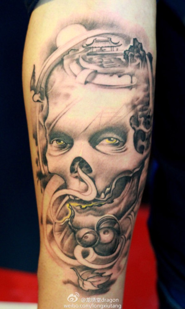 手臂霸气潮流的黑白骷髅纹身图案_骷髅纹身图案大全_纹身图吧