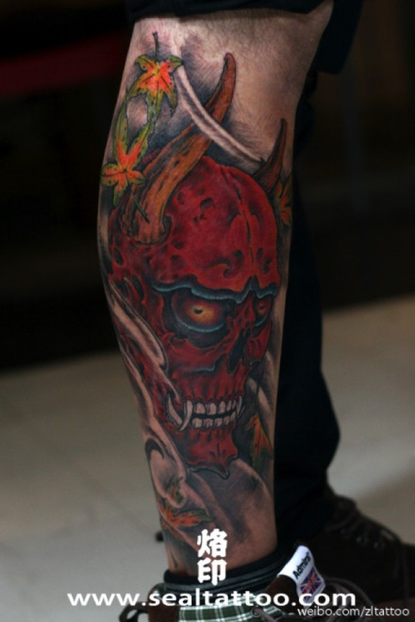 腿部一款霸气的有角的骷髅纹身图案_骷髅纹身图案大全_纹身图吧