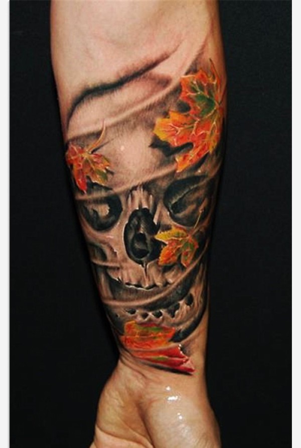 手臂漂亮时尚的欧美骷髅与枫叶纹身图案_骷髅纹身图案大全_纹身图吧
