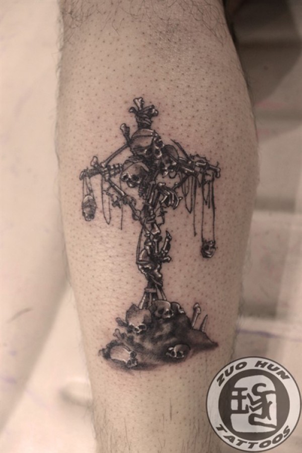 腿部超酷的一款骷髅天秤座纹身图案_骷髅纹身图案大全_纹身图吧