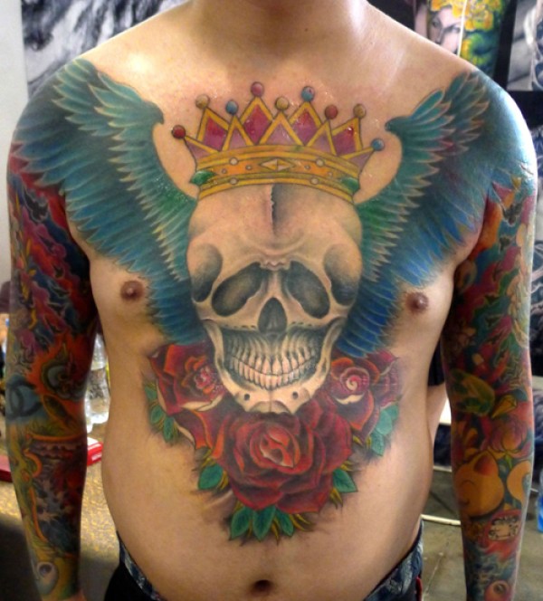男人前胸超酷的骷髅与翅膀纹身图案_骷髅纹身图案大全_纹身图吧