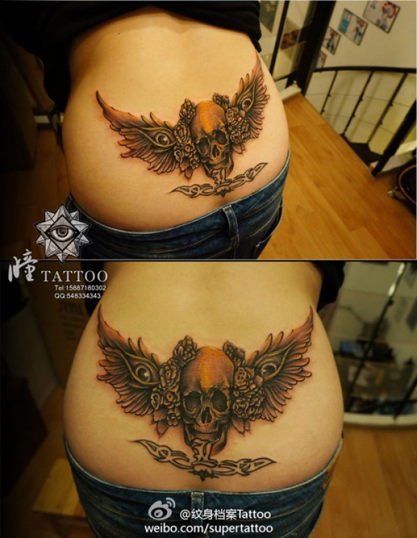 经典的美女腰部骷髅翅膀纹身图案_骷髅纹身图案大全_纹身图吧