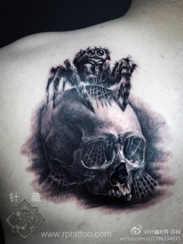 男人肩背超级酷的蜘蛛与骷髅纹身图案_骷髅纹身图案大全_纹身图吧