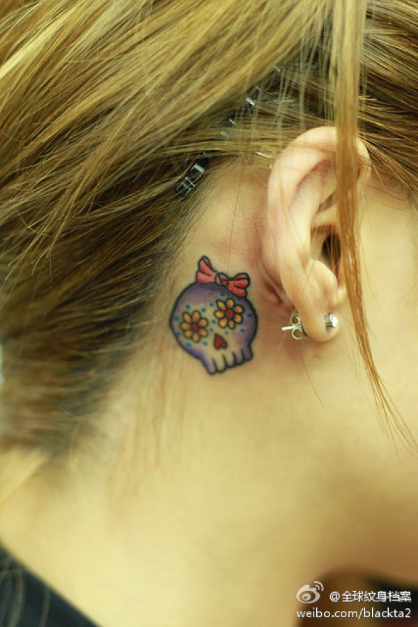 女生耳部小巧的彩色骷髅纹身图案_骷髅纹身图案大全_纹身图吧