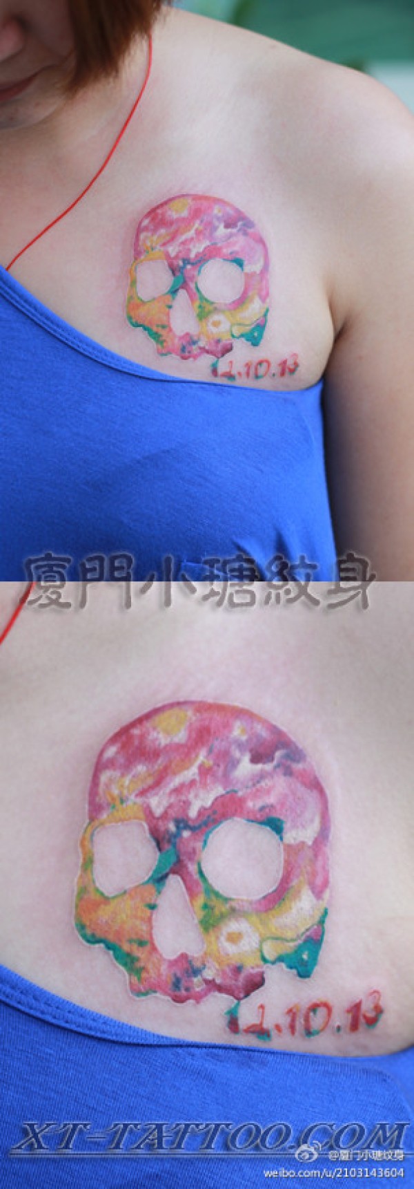 女孩子胸部炫丽的彩色骷髅纹身图案_骷髅纹身图案大全_纹身图吧