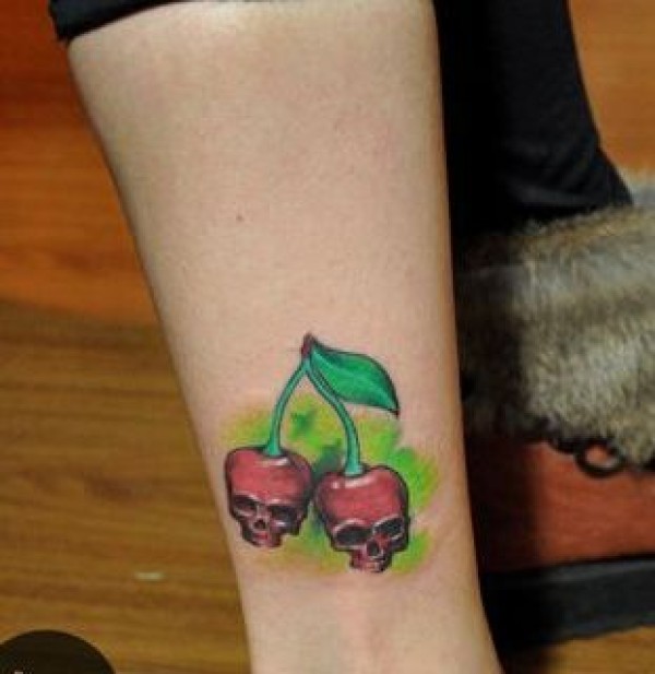 女生腿部精美的一款樱桃骷髅纹身图案_骷髅纹身图案大全_纹身图吧