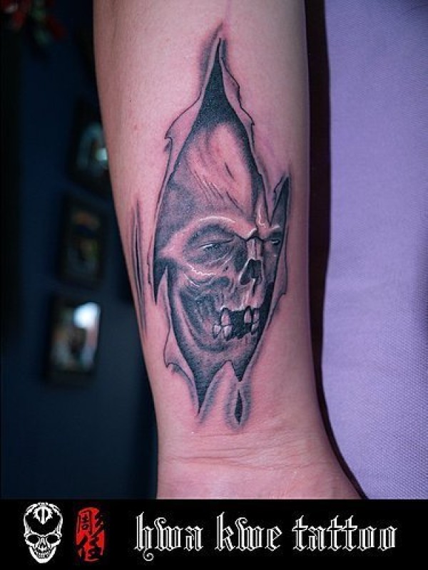 专业纹身店介绍一款手臂撕皮骷髅文身图案大全_骷髅纹身图案大全_纹身图吧