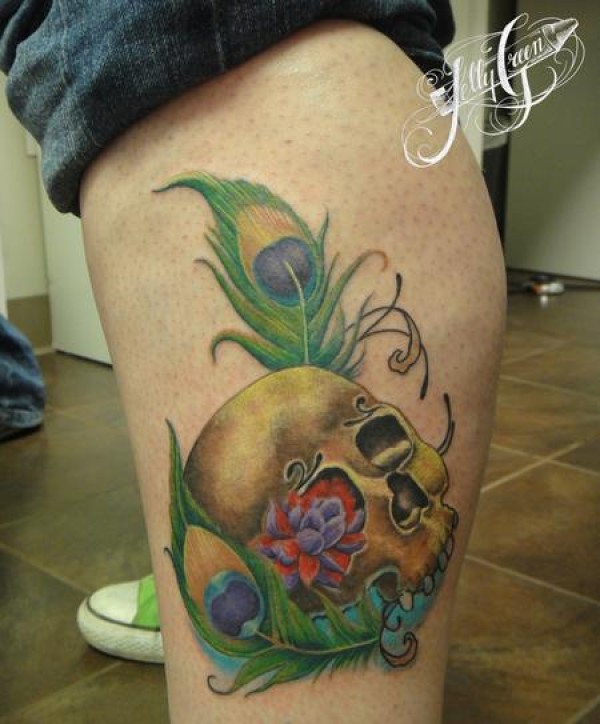 武汉文身店腿部超酷的一款骷髅羽毛文身图案_骷髅纹身图案大全_纹身图吧