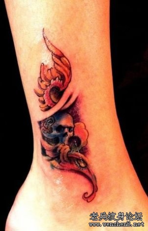 一款腿部彩色骷髅藤蔓纹身图案纹身图片_骷髅纹身图案大全_纹身图吧