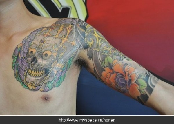 手臂骷髅菊花纹身_骷髅纹身图案大全_纹身图吧