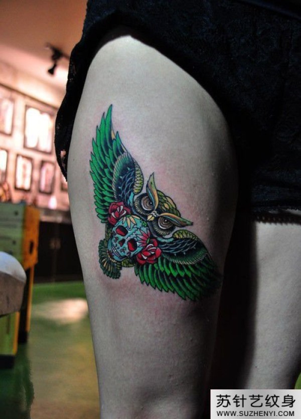 骷髅猫头鹰个性大腿纹身_骷髅纹身图案大全_纹身图吧