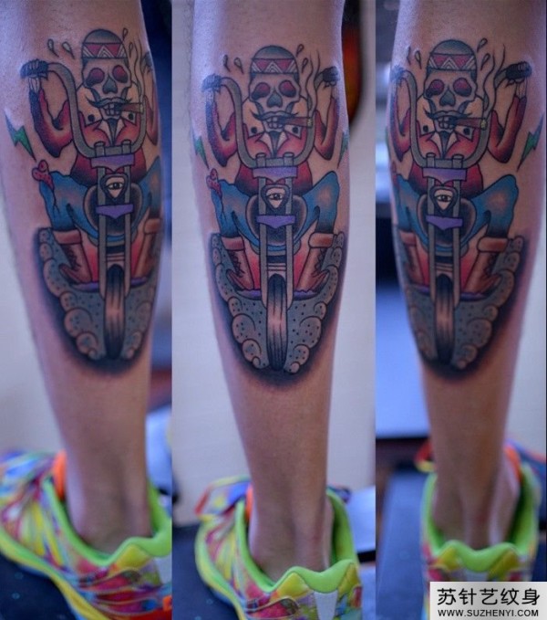 骑摩托的骷髅人花腿纹身_骷髅纹身图案大全_纹身图吧