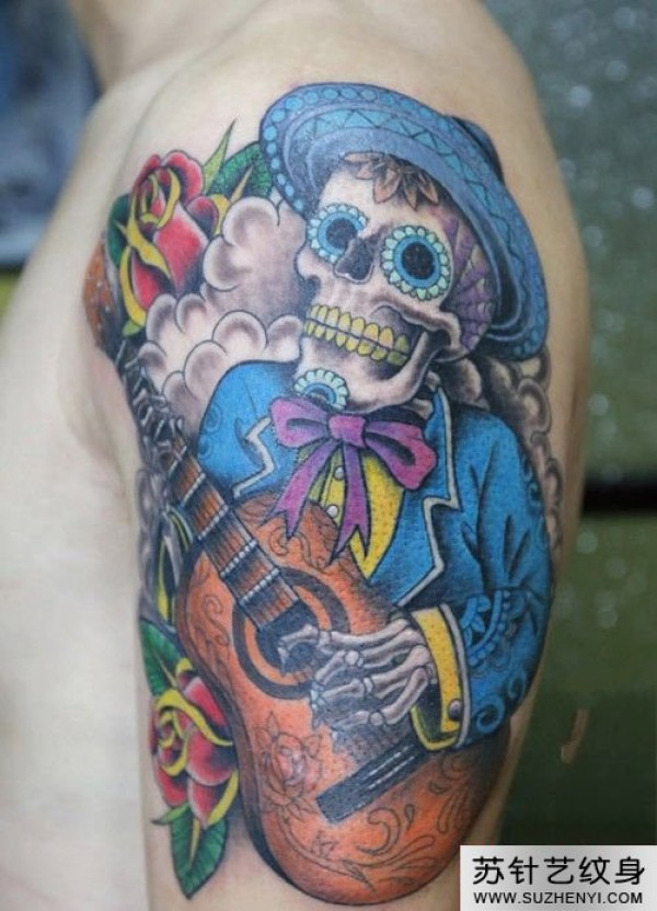 骷髅弹吉他手臂纹身_骷髅纹身图案大全_纹身图吧