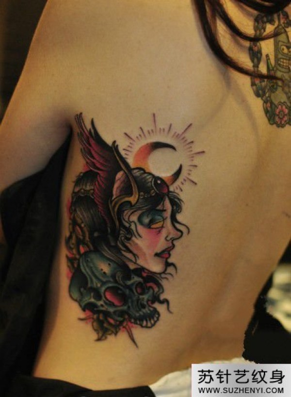 骷髅美女头像腰部纹身_骷髅纹身图案大全_纹身图吧