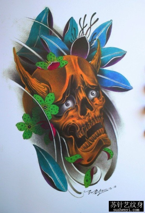 彩色莲花骷髅头_骷髅纹身图案大全_纹身图吧