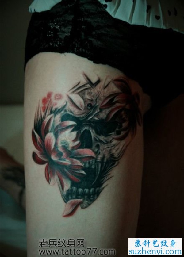 腿部经典的骷髅莲花纹身_骷髅纹身图案大全_纹身图吧