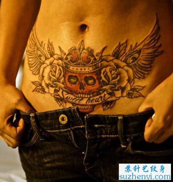 美女腹部戴皇冠的骷髅纹身图案_骷髅纹身图案大全_纹身图吧