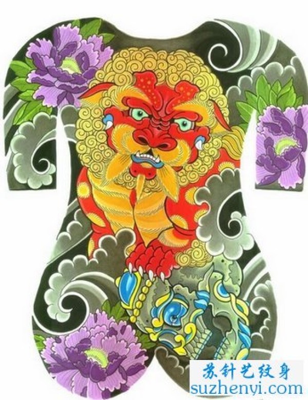 满背彩色神兽唐狮嘎巴拉牡_骷髅纹身图案大全_纹身图吧