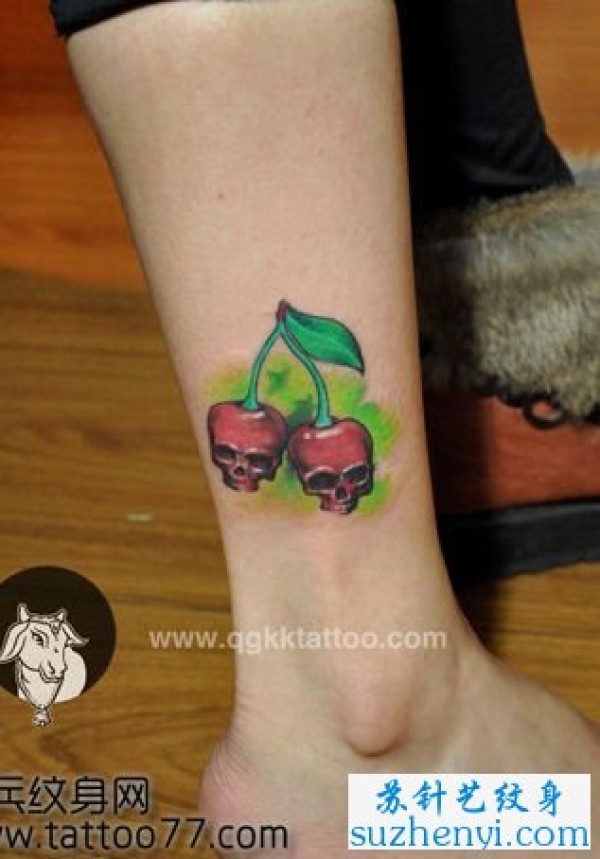 腿部彩色樱桃骷髅纹身_骷髅纹身图案大全_纹身图吧