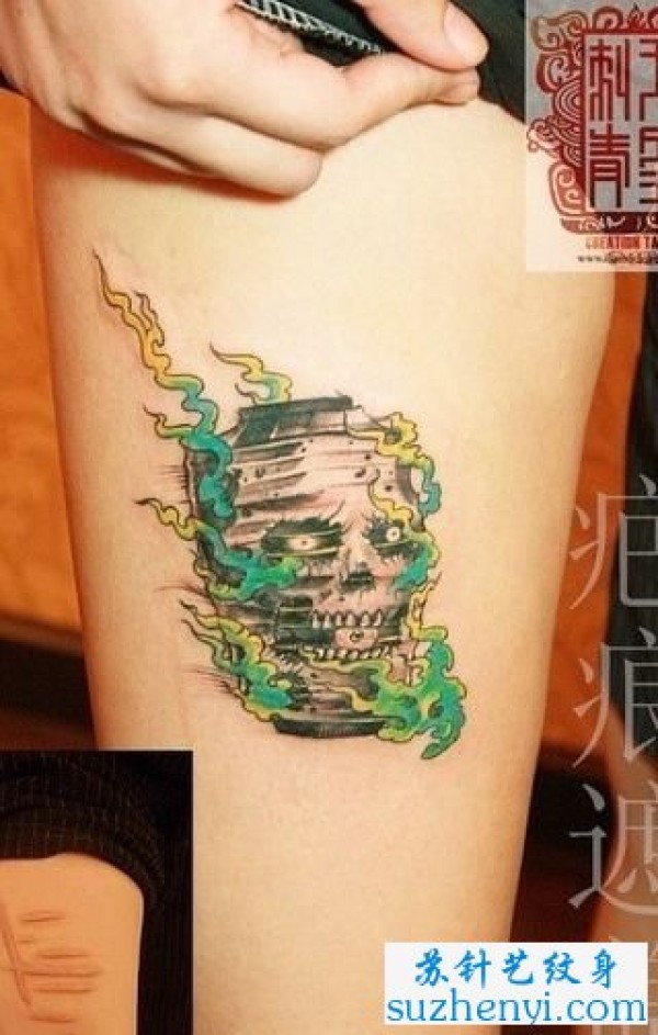 腿部彩色骷髅纹身_骷髅纹身图案大全_纹身图吧
