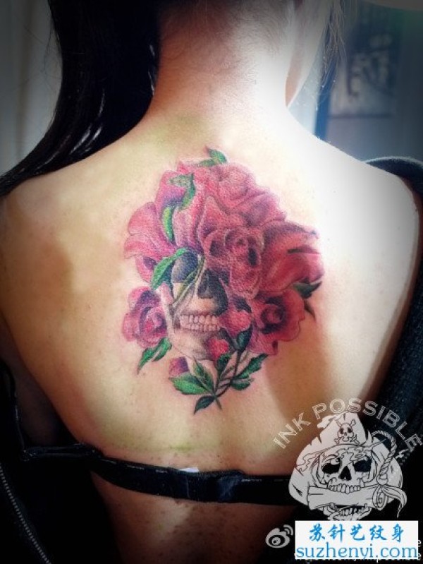 背部骷髅与花卉纹身_骷髅纹身图案大全_纹身图吧