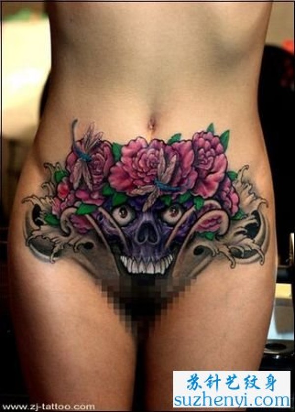 腹部骷髅花卉蜻蜓纹身_骷髅纹身图案大全_纹身图吧