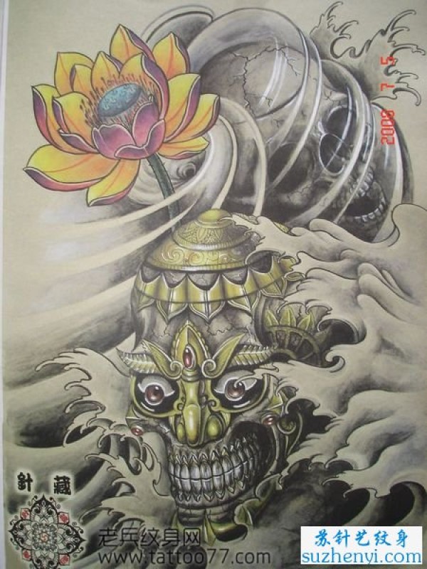 嘎巴拉莲花纹身手稿_骷髅纹身图案大全_纹身图吧