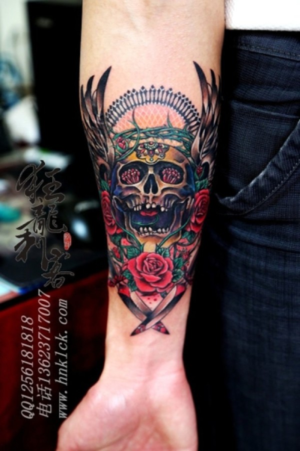 手臂骷髅菊花纹身_骷髅纹身图案大全_纹身图吧