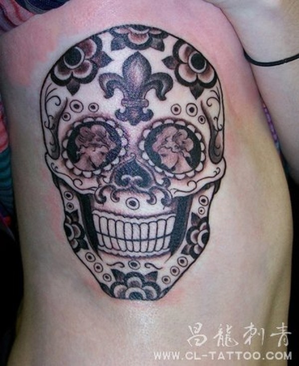 女生侧肋时尚骷髅_女生黑白_骷髅纹身图案大全_纹身图吧