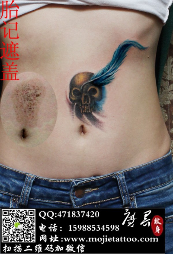 羽毛骷髅遮盖胎记纹身_骷髅纹身图案大全_纹身图吧