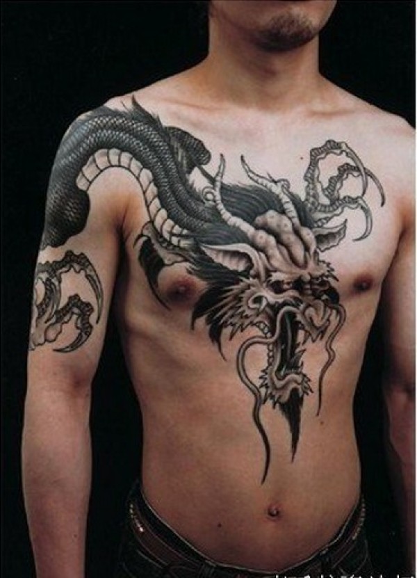 过肩黑体猛龙纹身,感觉这个模特瘦了一点_龙纹身图案大全_纹身图吧