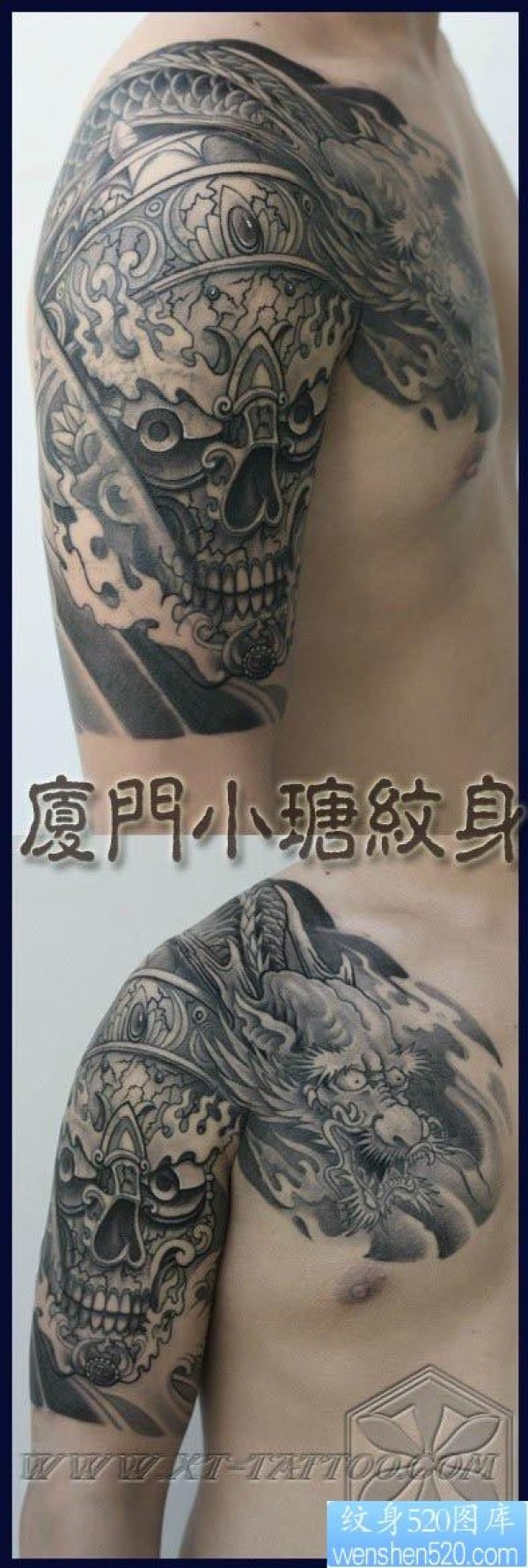 很帅经典的一幅半甲龙与嘎巴拉纹身图片图片_龙纹身图案大全_纹身图吧