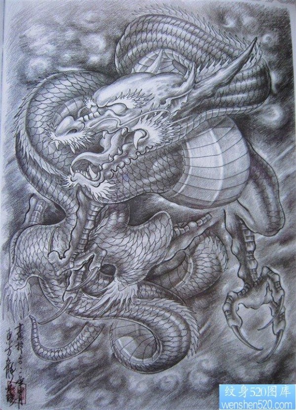 龙纹身手稿_一组老传统黑灰龙手稿纹身图案
