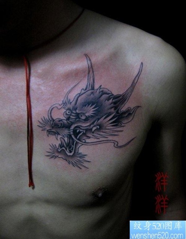 男生胸部经典的黑灰龙头纹身图片_龙纹身图案大全_纹身图吧