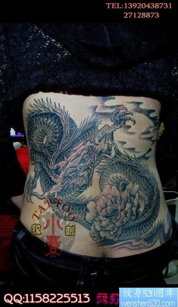 美女背部龙戏牡丹纹身图片_龙纹身图案大全_纹身图吧