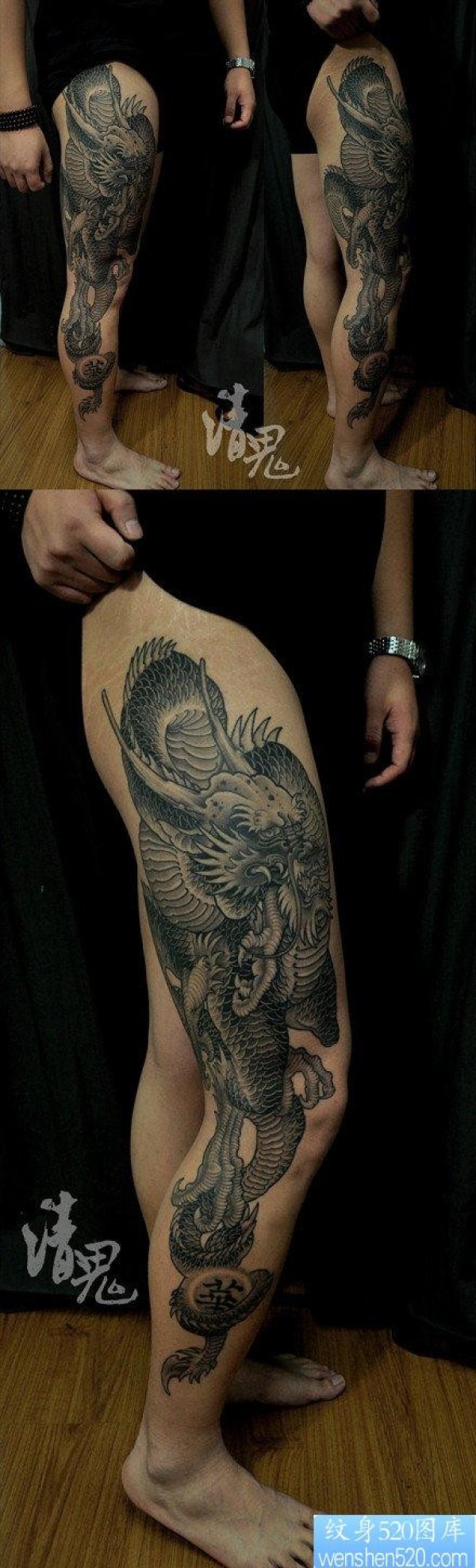 男生腿部霸气的传统黑灰龙纹身图片_龙纹身图案大全_纹身图吧